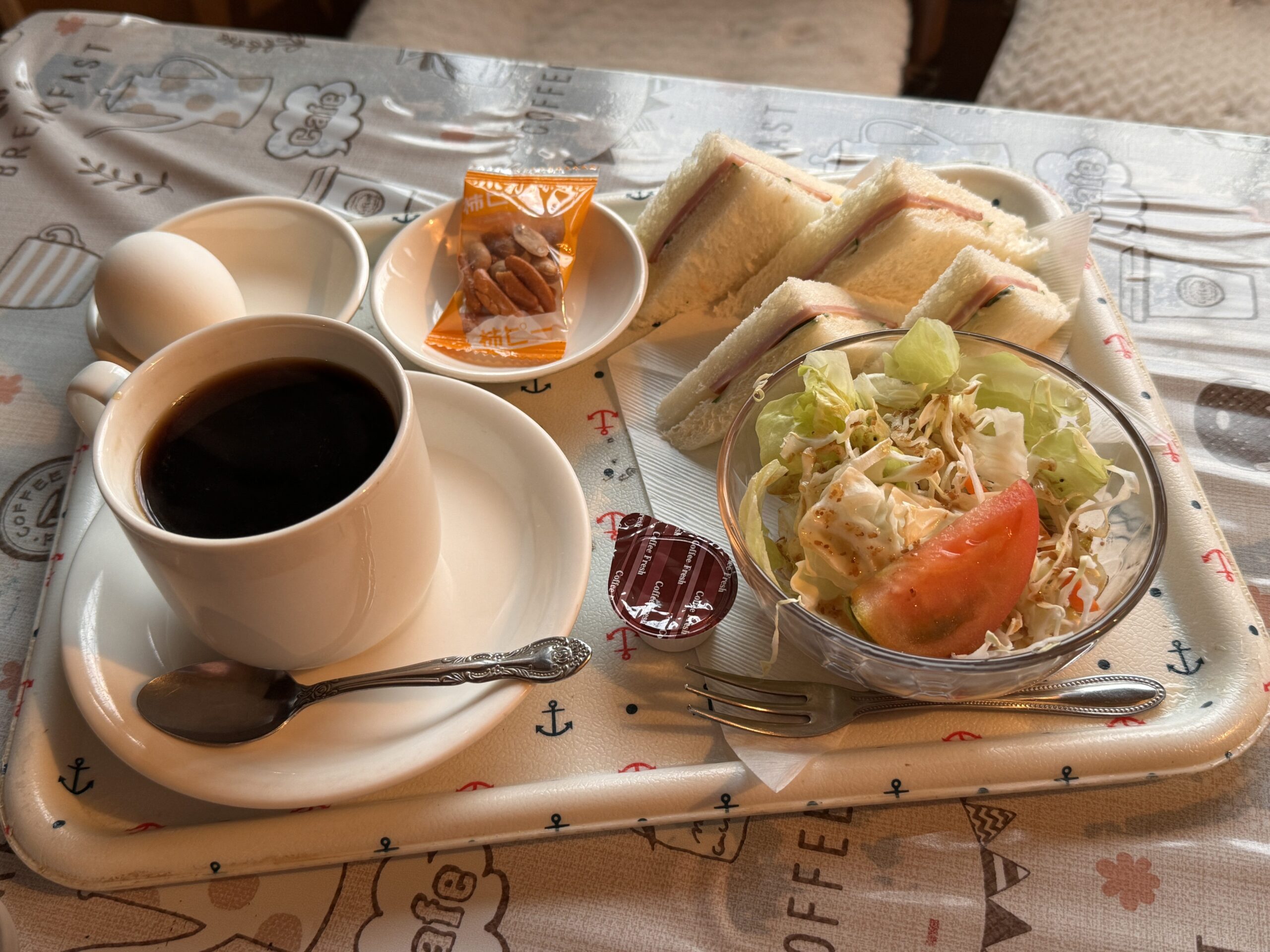 私がいつも頼むのは「モーニングプレート」。サラダとサンドイッチ、ゆで卵にコーヒーが付いて回数券を使うと300円。通常でも350~400円ほどだったと記憶している。